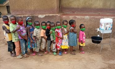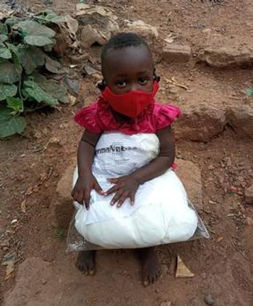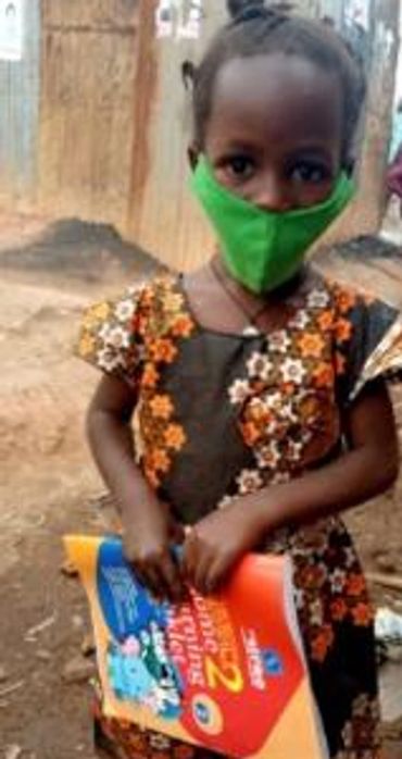 Little Amorah holds her sleeping net while wearing her mask, both provided by kind people like you.